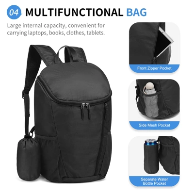 This backpack is made of durable polyester for exceptional durability. It’s built to withstand scrapes from branches, rocks, and harsh outdoor conditions. Its spacious storage offers ample storage space, including a main zippered compartment, a front zippered pocket, and two side mesh pockets for water bottles or other quick-access items. Perfect for city tours, camping trips, or shopping, this foldable backpack can accommodate all your essentials. Whether you’re a hiker, traveler, or simply a lover of the outdoors, this is the ideal choice.